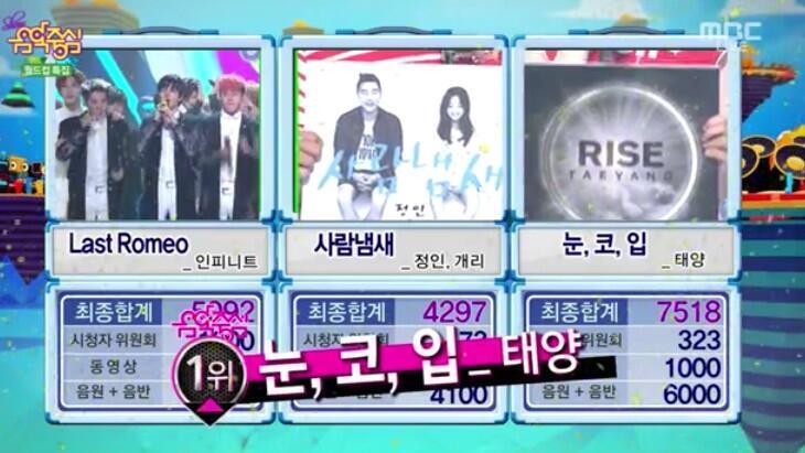 On the 14th of June, Taeyang’s “Eyes, Nose, Lips” ranked 1st on Music Core against Jungin & Gary’s “Your Scent” and Infinite’s “Last Romeo”.
