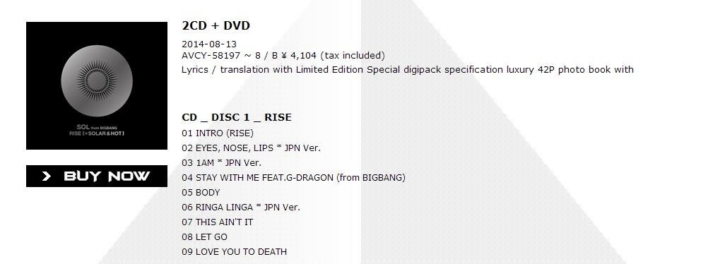 01 INTRO(RISE)  02 EYES,NOSE,LIPS *JPN Ver.  03 1AM *JPN Ver.  04 STAY WITH ME FEAT.G-DRAGON (from BIGBANG)  05 BODY  06 RINGA LINGA *JPN Ver.  07 THIS AIN'T IT  08 LET GO  09 LOVE YOU TO DEATH